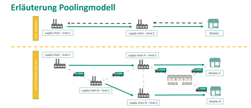 Statt eines linearen Transportes von standardisierten Ladungsträgern, bei denen nach Ablieferung der Ware das Leergut aufwändig zurück zum Besitzer transportiert wird, werden im Poolingmodell Netzwerkeffekte genutzt, indem Leergut über ein Depotsystem vor Ort abgegeben und von anderen Nutzern von Standardladungsträgern wieder aufgenommen und weiterverwendet wird.