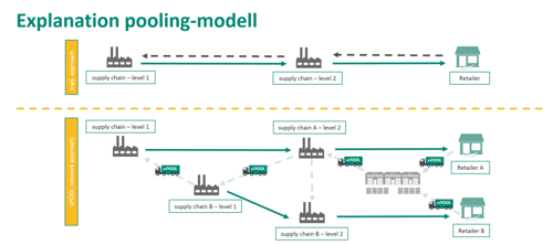 En lugar de un transporte lineal de soportes de carga estandarizados, en el que una vez entregado el contenedor se devuelve al propietario, el modelo de pooling aprovecha los efectos de red al entregar los contenedores vacíos a través de un sistema de depósito in situ y recogerse y reutilizarse por otros usuarios de soportes de carga estandarizados.